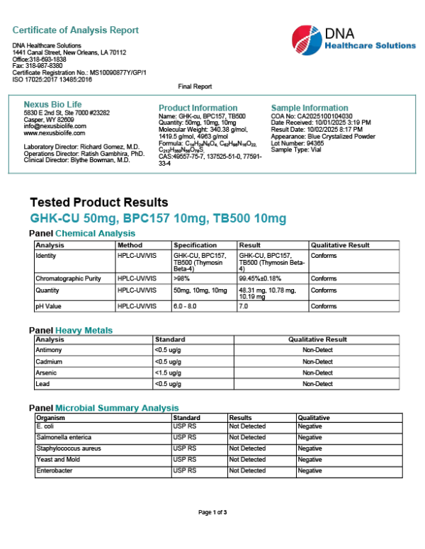 In summary, the GHK-Cu/BPC-157/TB-500 combination offers a robust platform for probing regenerative synergies, blending antioxidant, cytoprotective, and cytoskeletal mechanisms in controlled settings. Its potential inspires our commitment to quality peptides that advance science with integrity. Strictly for in-vitro research, this blend embodies our approachable expertise. Let's collaborate on your next breakthrough, one experiment at a time.