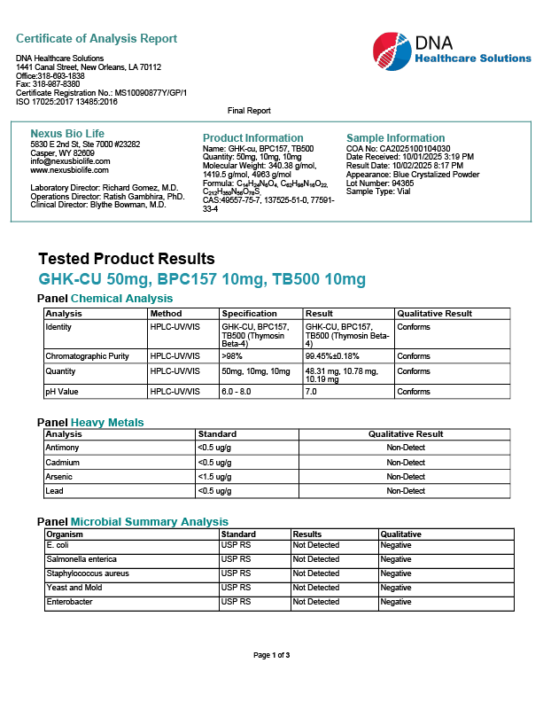 The GHK-Cu/BPC-157/TB-500 combination integrates three distinct peptides—GHK-Cu, a tripeptide-copper complex; BPC-157, a pentadecapeptide derived from gastric proteins; and TB-500, the synthetic form of thymosin beta-4—to investigate synergistic effects on tissue repair, inflammation reduction, and cellular regeneration in experimental models. This blend harnesses GHK-Cu's antioxidant and wound-healing properties, BPC-157's cytoprotective actions, and TB-500's actin-modulating capabilities, potentially amplifying outcomes in studies of musculoskeletal healing and metabolic stress. As with all our peptides, the GHK-Cu/BPC-157/TB-500 combination is supplied strictly for research purposes and in-vitro use only—not for human consumption or any therapeutic applications.