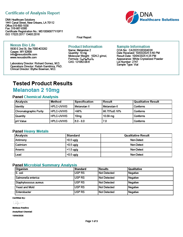 In practical lab terms, Melanotan II is supplied as a lyophilized powder with purity levels typically over 98%, confirmed by HPLC and mass spectrometry. It demonstrates good solubility in aqueous buffers, but its cyclic nature may require careful pH control to maintain conformational integrity. Our transparent quality processes ensure each batch is tested for consistency, so you can rely on it for precise, reproducible results in your studies.