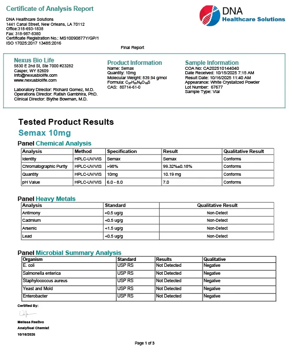 Researchers often apply Semax in neurobiology studies, such as primary cortical neuron cultures to assess neuroprotection against glutamate excitotoxicity or in hippocampal slice assays for synaptic plasticity enhancements. It's also utilized in behavioral models, like maze tasks in mice to evaluate cognitive augmentation under stress, and in stroke simulations for infarct size reduction via anti-apoptotic pathways. We confirm our Semax's quality through comprehensive purity testing, ensuring dependable results in your experiments.